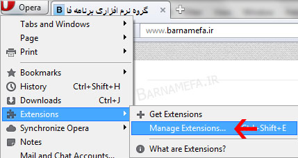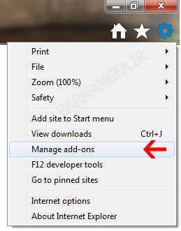 ۱- منوی اصلی مرورگر را باز کنید و روی گزینه ی Manage add-ons کلیک نمایید.