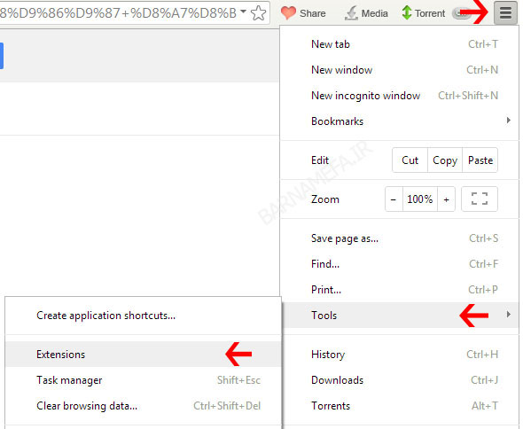 ۱- منوی اصلی مرورگر با باز کنید و نشانگر ماوس را بر روی گزینه ی Tools نگه دارید و سپس روی منوی Extensions کلیک نمایید.