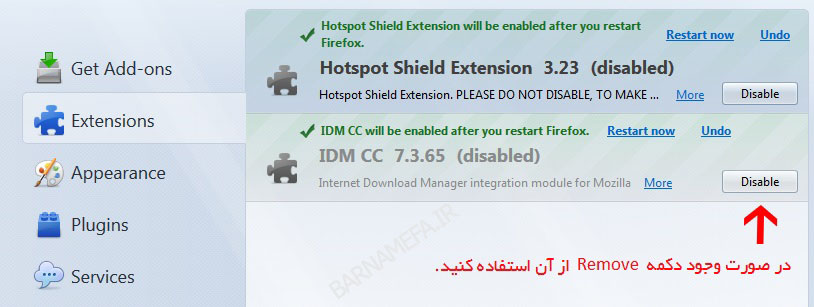 ۲ – در صفحه ی باز شده تمام پلاگین های موجود در لیست را با کلید Unistall یا Disable حذف کنید.